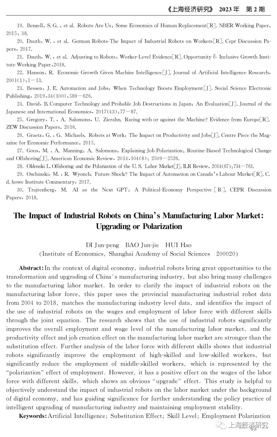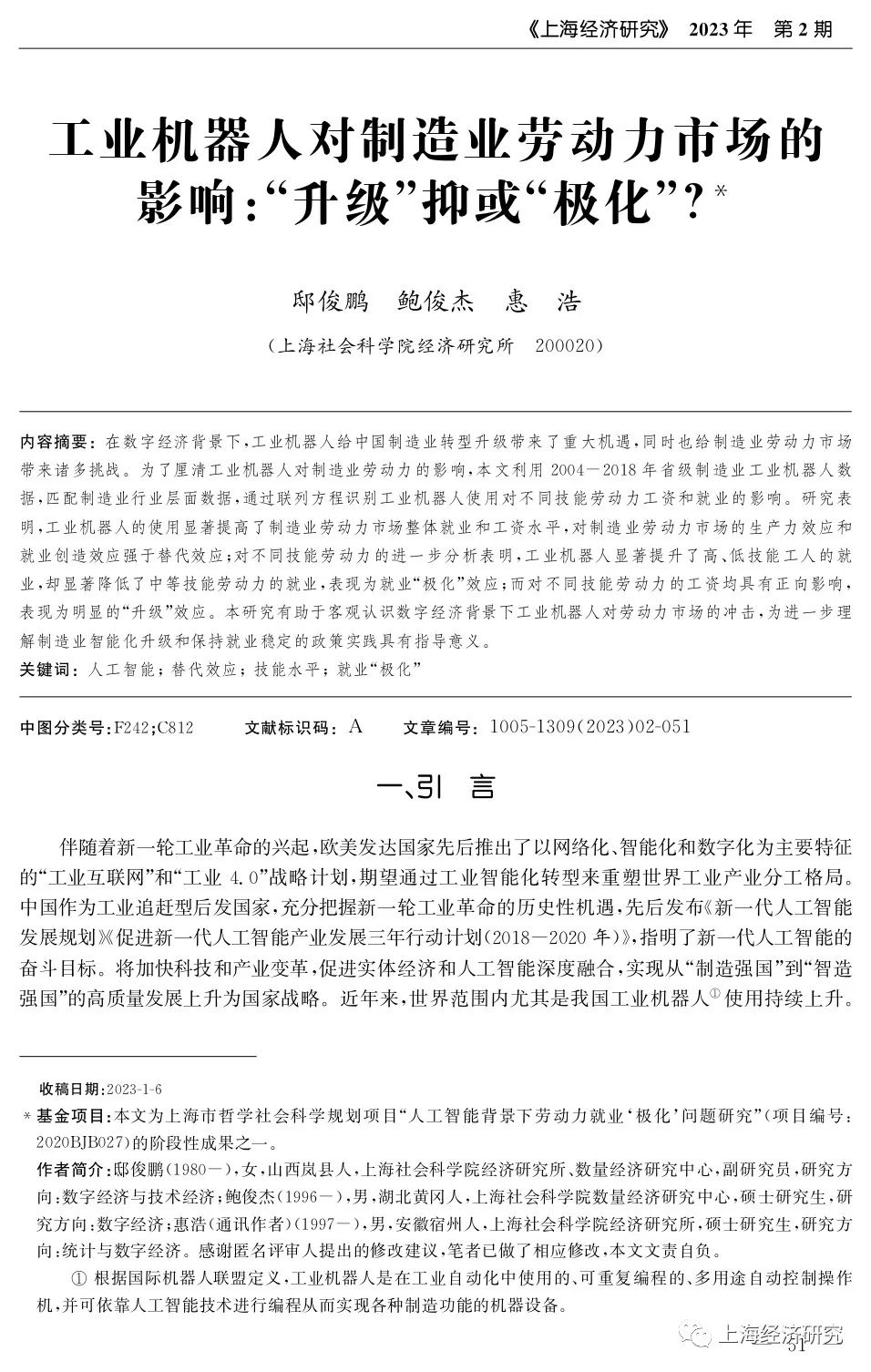 邸俊鹏、鲍俊杰、惠浩:工业机器人对制造业劳动力市场的影响:“升级"抑或"极化"?