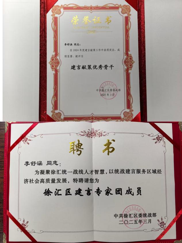 李舒涵同志立足民生关切,围绕“过江难”、滨江水岸经济发展等现实问题建言献策,成果分别获得相关市、区领导的肯定性批示。同时,李舒涵同志被聘任为“徐汇区建言专家团成员”,并荣获“建言献策优秀骨干”荣誉证书。