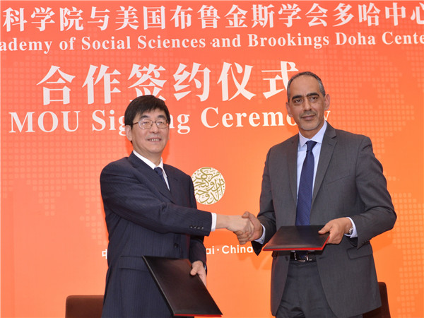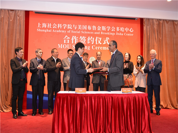 2018年1月13-14日,上海社会科学院与美国布鲁金斯学会多哈中心合作签约仪式暨“‘一带一路’:中国与中东合作的新机遇”国际学术研讨会在我院小礼堂举行。院党委书记于信汇和布鲁金斯学会多哈中心主任塔力克·尤素福出席签约仪式并致辞,并代表合作双方签署正式合作谅解备忘录。