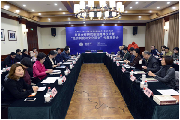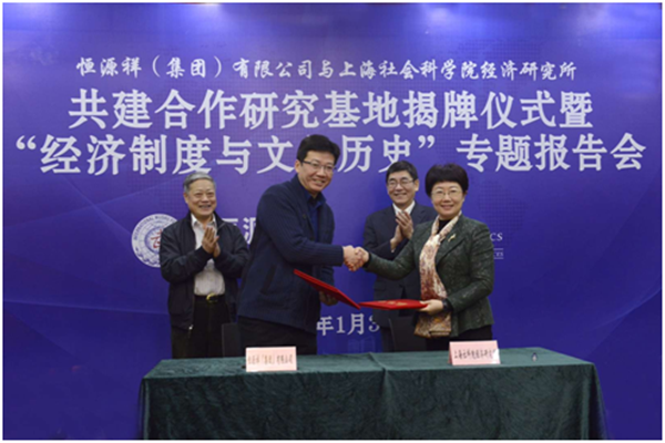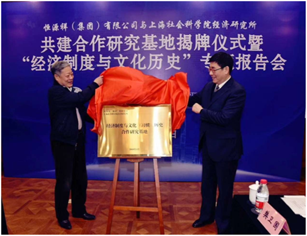 1月30日上午,上海社科院经济研究所与恒源祥(集团)有限公司举办共建合作研究基地揭牌仪式暨“经济制度与文化历史”专题报告会。上海社科院党委书记于信汇出席会议并致辞,恒源祥(集团)有限公司党委书记、董事长刘瑞旗致辞并作“经济制度与文化历史”专题报告。会上,于信汇、刘瑞旗共同为合作研究基地揭牌,经济研究所所长沈开艳、恒源祥(集团)有限公司总经理陈忠伟分别代表双方在合作协议书上签字。上海社科院党委副书记王玉梅主持仪式。