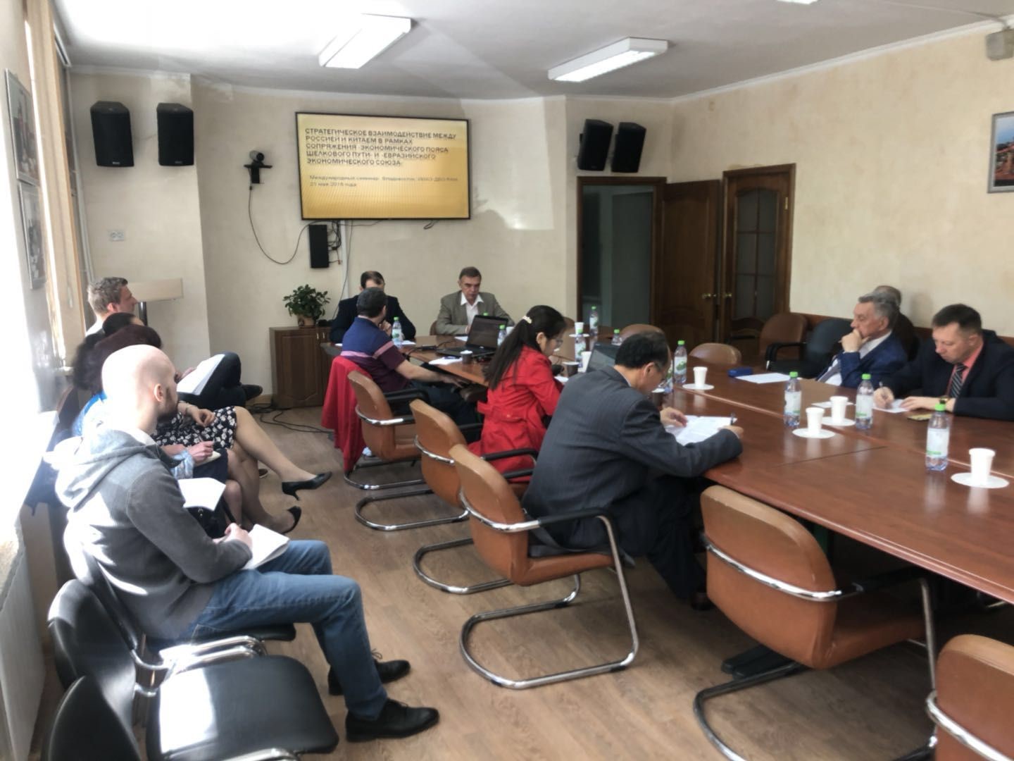 在访问俄罗斯期间,俄罗斯联邦委员会经济委员会主席、俄中友好协会主席、上海合作组织前秘书长梅津采夫会见了我院代表团,和于信汇就俄中友好关系以及与我院的可能合作等进行了会谈交流。同时,我院代表团还赴俄罗斯远东城市符拉迪沃斯托克考察了超前发展区,并与俄罗斯科学院远东分院历史考古与民族志研究所联合举办“丝绸之路经济带与欧亚经济联盟对接框架下的中俄战略互动”圆桌讨论会,与该研究所所长萨甫琴科、前所长拉林等专家就双方合作课题成果进行交流,并就下一步合作研究事宜进行讨论。代表团还访问了远东联邦大学,与地区与国际关系研究院副院长卢金等进行了交流。