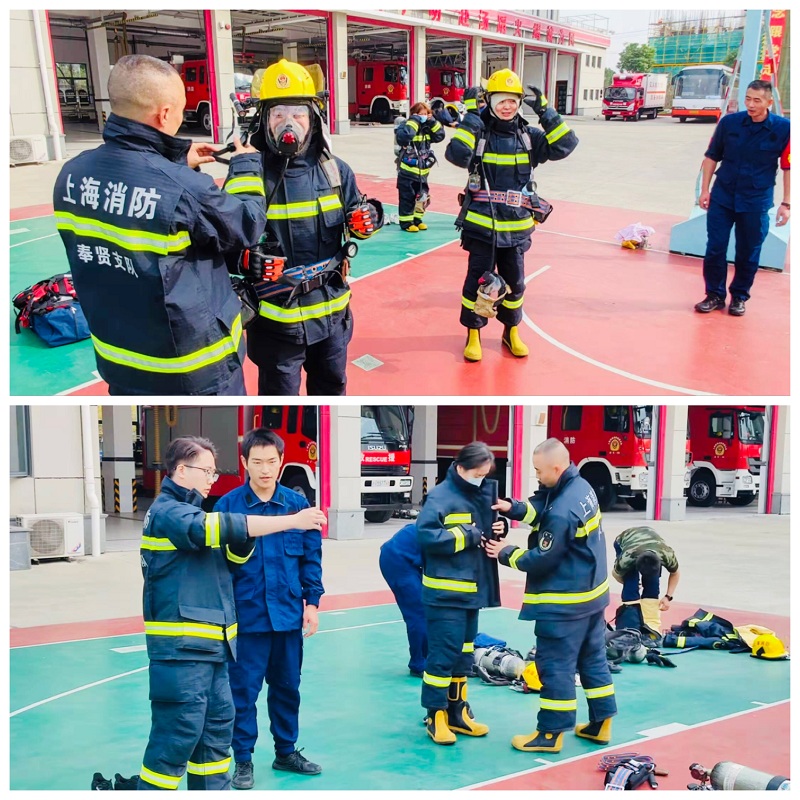 本次活动首先邀请救援站警官向师生职工讲解消防战斗服的基本构成,请消防官兵模拟真实出警场景,示范在短时间内完成约60斤重的消防战斗服及救灾器材穿戴任务,并进行现场互动。我院四位职工和研究生亲身体验了消防战斗服和水域救援服的穿戴,并感受火灾现场消防员呼吸瓶的使用。