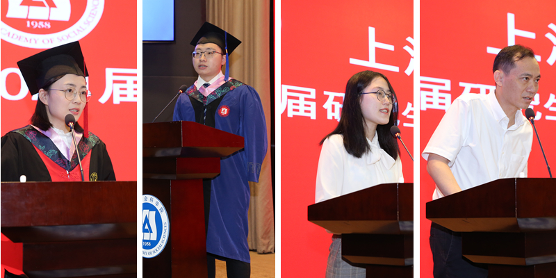 应届毕业生代表、博士潘秋晨感谢上社给予经世济民的底气,受苦受挫而不短志的骨气和愈燃愈亮的理想信念之火;硕士陈超以李大钊先生的“以青春之我,创建青春之家庭、青春之国家、青春之民族”号召青年一代担起中华民族伟大复兴的责任和使命;在读硕士生代表、2019级旅游管理专业张自颖表示要以学长学姐为榜样,学习勤勉踏实、求真务实的治学态度与独立自主、积极进取的生活态度;校友代表、上海WTO事务咨询中心总裁黄鹏回想起18年前进入上海社科院读书的青葱岁月,他希望大家在雄鹰展翅、搏击长空之时,能够继续保持学习、思考和探索的精神。