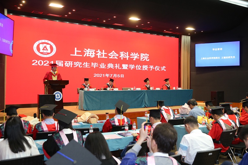 2021年7月5日上午,上海社会科学院2021届研究生毕业典礼暨学位授予仪式在上海社会科学院分部社科国际创新基地多功能厅隆重举行。上海社会科学院院长王德忠,院党委副书记王玉梅,副院长朱国宏、王振、干春晖出席典礼。各所领导、导师代表、校友代表、2021届全体毕业生共250余人齐聚典礼现场,见证成长与收获。研究生院院长朱平芳主持典礼。