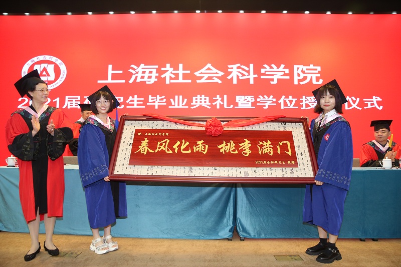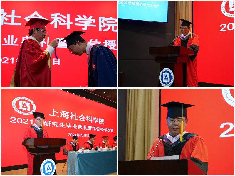 会上,干春晖副院长宣读了“2021年度上海社会科学院优秀毕业研究生”名单,王振副院长宣读了“2021年度上海市优秀毕业研究生”名单并颁发荣誉证书。在朱国宏副院长宣读“上海社会科学院授予学位决定”后,王德忠院长为全体毕业生拨穗、颁发证书并合影留念。