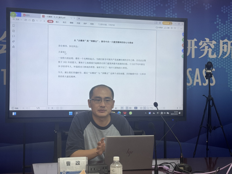 上海社会科学院青年讲师团成员、宗教所曹政老师分享了浙江台州理论宣讲之行的经验。曹政以“红色精神的哲学追问与实践路径”为主题,从哲学视角破题,以“从何处来、到何处去”为框架,系统阐释红色精神的历史逻辑与当代价值,并结合大陈岛垦荒精神的实地见闻,生动展现了红色基因的实践传承。